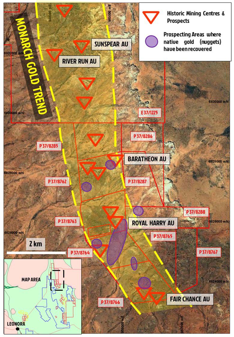"Our work program on the Monarch Trend is showing an unusually high density of historic workings through the Company's tenure, with the prospecting teams finding native gold (in the form of nuggets) associated with these workings and their surrounds. We're encouraged by the apparent lack of modern exploration in the area as it represents an exciting opportunity for the Company".