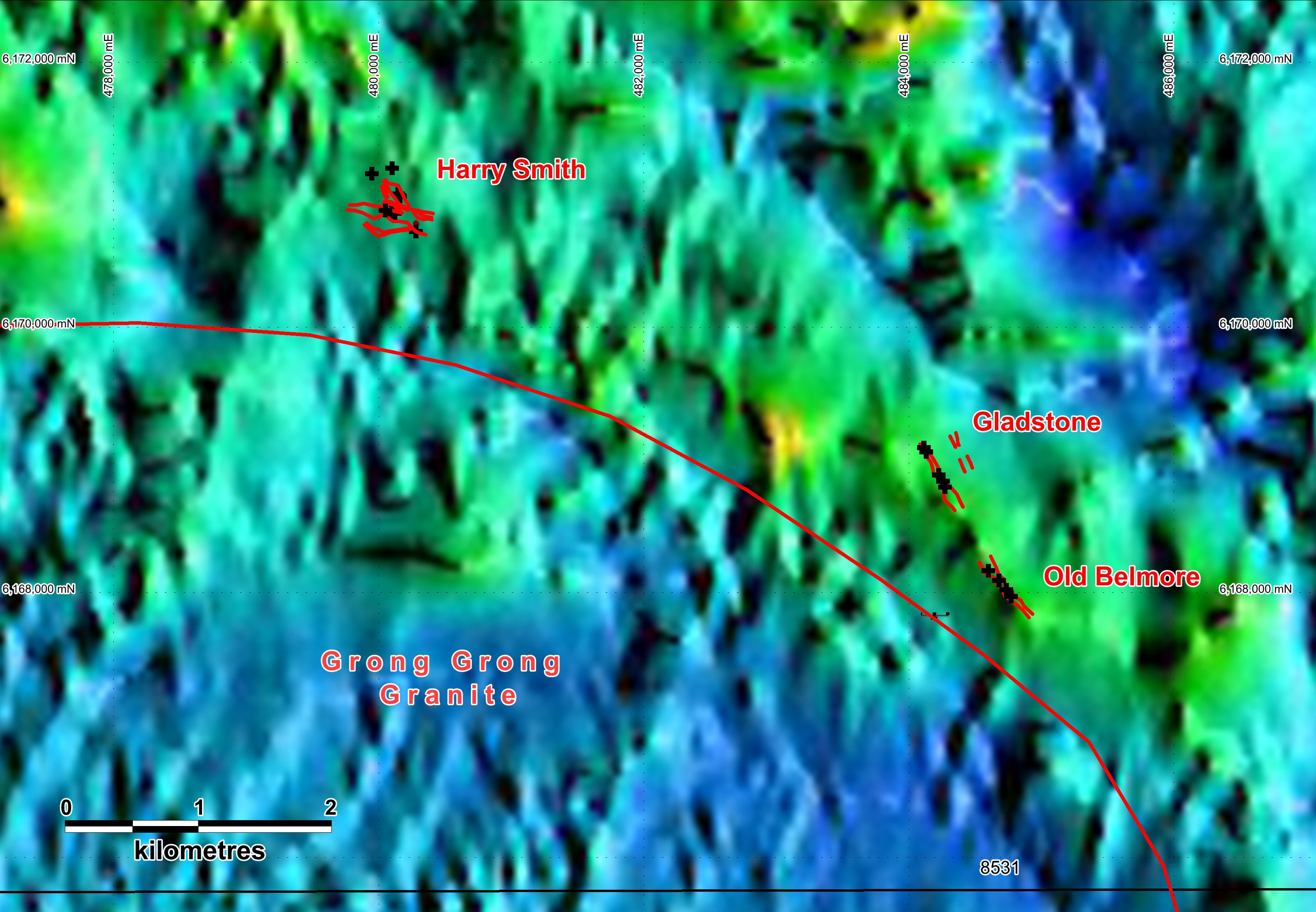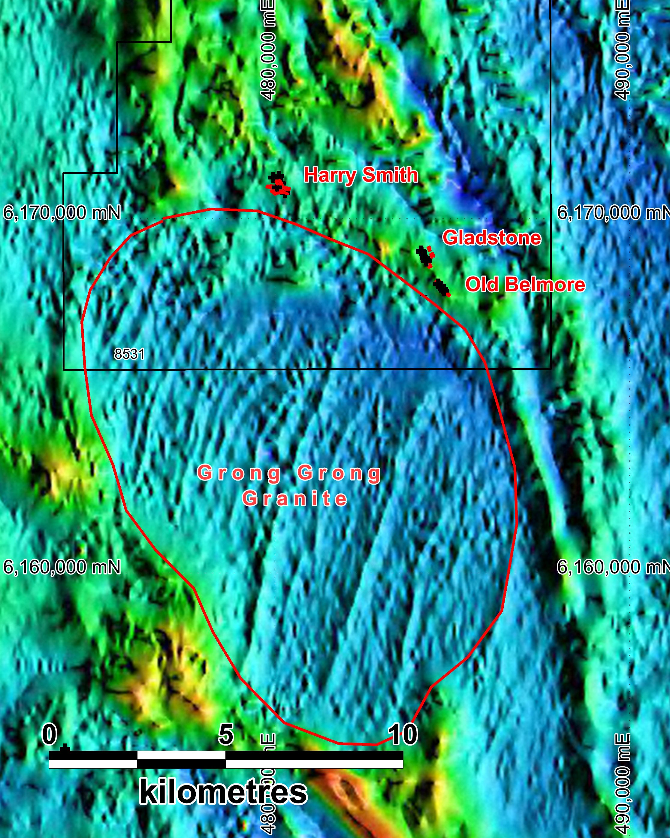 The Silurian age Grong Grong granite is magnetically quiet (blue colour on Figures 3 and 4 (see link below) represents low magnetism) and intrudes magnetic metasediments (the Ordovician Wagga Metamorphics: yellow to red colours). In detail, the Harry Smith and Gladstone-Old Belmore gold prospects appear to reside on magnetic highs running sub-parallel to the interpreted granite boundary, about 500m to 1km north of it (see Figure 4 in link below). This magnetic feature is disrupted by multiple NE-SW "faults" resulting in a jagged pattern.
