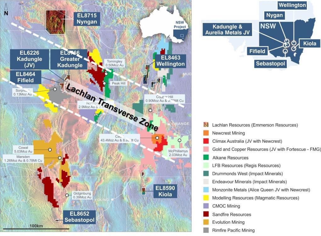 Emmerson Resources Limited (ASX:ERM) (FRA:42E) recently commenced exploration on new gold-copper projects in NSW, identified (with our strategic alliance partner Kenex Limited) from the application of 2D and 3D predictive targeting models – aimed at increasing the probability of discovery. The highly prospective Macquarie Arc in NSW hosts >80Mozs gold and >13Mt copper with these resources heavily weighted to areas of outcrop or limited cover. Emmerson's five exploration projects contain many attributes of the known deposits within the Macquarie Arc but remain under explored due to historical impediments, including an overlying cover (plus farmlands) and a lack of exploration focus. Kadungle is a JV with Aurelia Metals covering 43km2 adjacent to Emmerson's Fifield project.