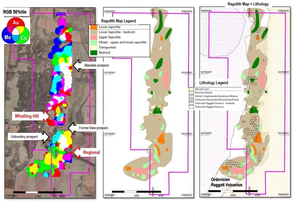 This window of prospective Ordovician rocks is anomalous in metals and mostly covered by regolith (see Figure 4 in link below). Trace element analyses of epidote from the recent aircore drilling reinforce previous conclusions that this belt is prospective for porphyry copper-gold and epithermal gold-silver mineralization (as determined from collaboration with the University of Tasmania via the ARC Linkage Project (see Figure 5 in link below).