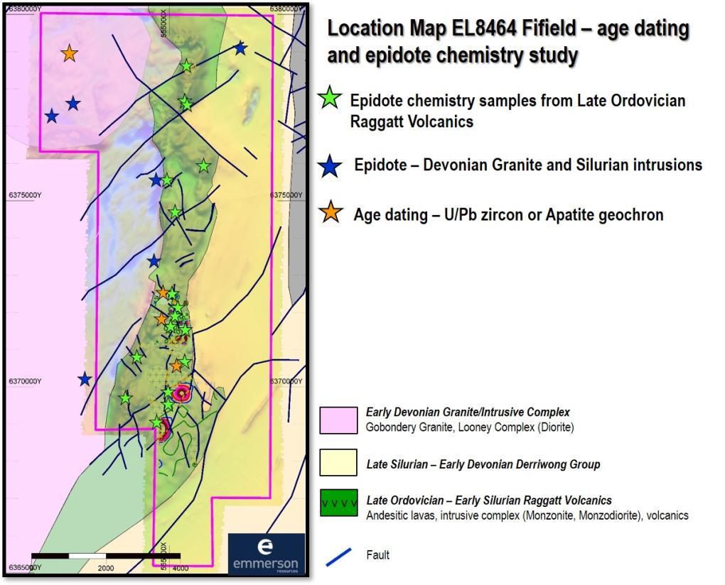 Our field-based exploration has been complemented by cutting edge science which has included analysis of the alteration (trace and rare earth elements within the outer green rock or epidote/chlorite zone) where initial findings suggest we are within the geochemical footprint of a porphyry system. Moreover, age dating of the monzonite intrusion within the Raggatt Volcanics yielded a Late Ordovician to Early Silurian age -consistent with dates of the mineralised intrusions at the world-class North Parkes and Cadia-Ridgeway gold-copper deposits (work completed as part of the University of Tasmania CODES ARC Linkage project)